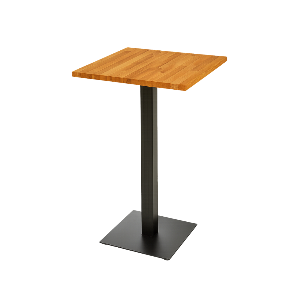 Podstawę stołu wykonano z malowanej proszkowo stali. Profil o przekroju 70×70 mm i dolna blacha 460×460 mm zapewniają stabilność, nawet przy intensywnym użytkowaniu. Sama podstawa waży ok. 17 kg, dzięki czemu cały stół pozostaje stabilny i bezpieczny, nawet gdy goście opierają się na blacie. Wysokość 100 cm idealnie współgra z hokerami barowymi, tworząc komfortowe warunki do spożywania posiłków i napojów.